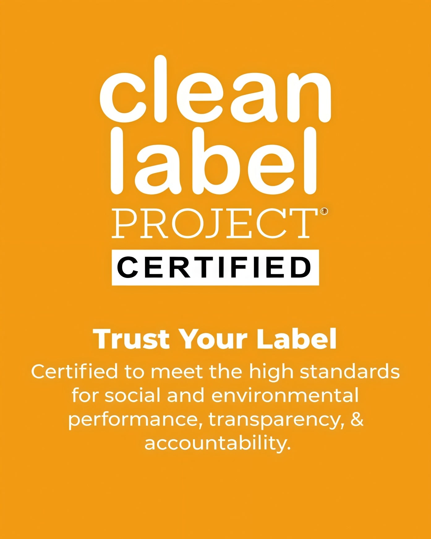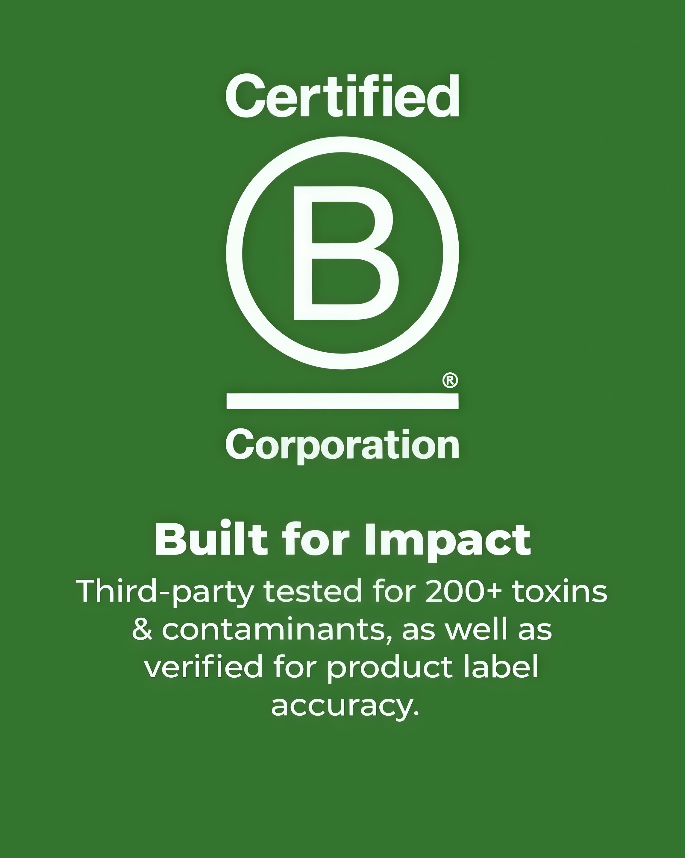 Our products meet top social and environmental standards as a Certified B Corporation. Clean Label Project certified with third-party testing for 200+ toxins, and made in FDA-approved GMP facilities for reliable quality and safety.