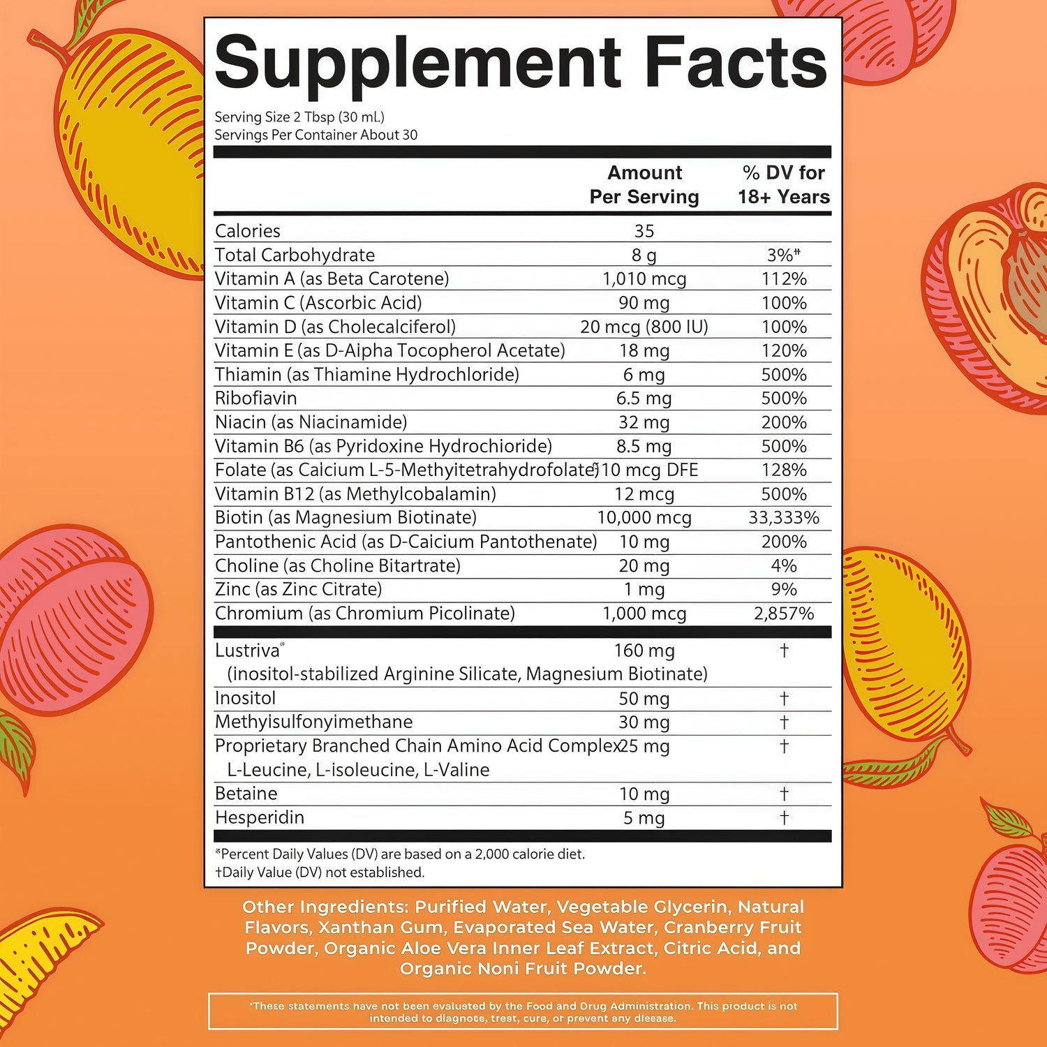 Meet MaryRuth’s Liquid Morning Multivitamin + Hair Growth — a nutrient-rich formula crafted to fuel your wellness from the inside out. Featuring clinically studied Lustriva to support thicker, fuller hair in as little as three weeks, plus vitamin C, a full B-complex (including highly soluble 10,000 mcg biotin), D3, and chromium picolinate for metabolism and blood sugar support. Take two tablespoons daily in delicious peach mango or dragon fruit melon flavor — vegan, sugar-free, and made in a GMP-certified facility.